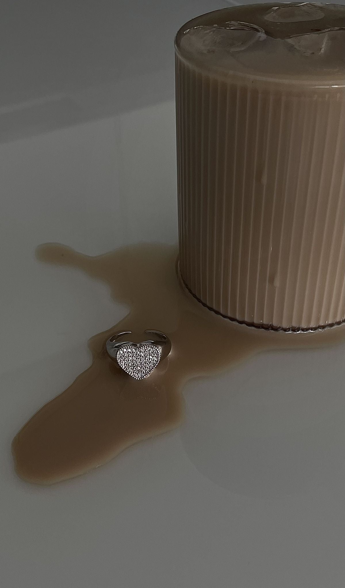 Il cuore brunito, protagonista al centro, incontra la brillantezza dei zirconi bianchi che lo avvolgono in un abbraccio di luce.