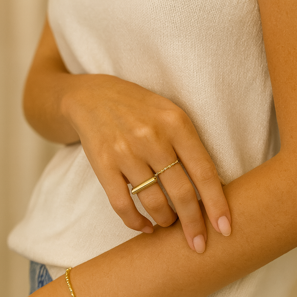 Perfetto per essere indossato da solo per un effetto minimal chic, oppure abbinato ad altri anelli per creare layering sofisticati e di tendenza.