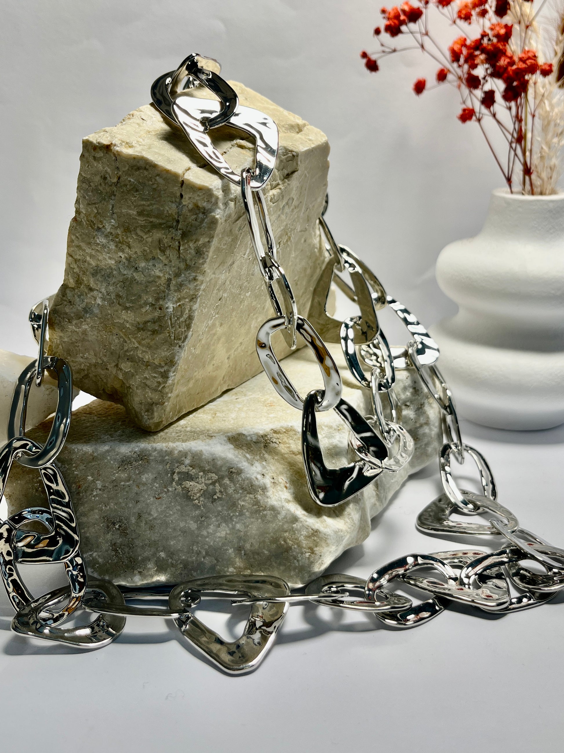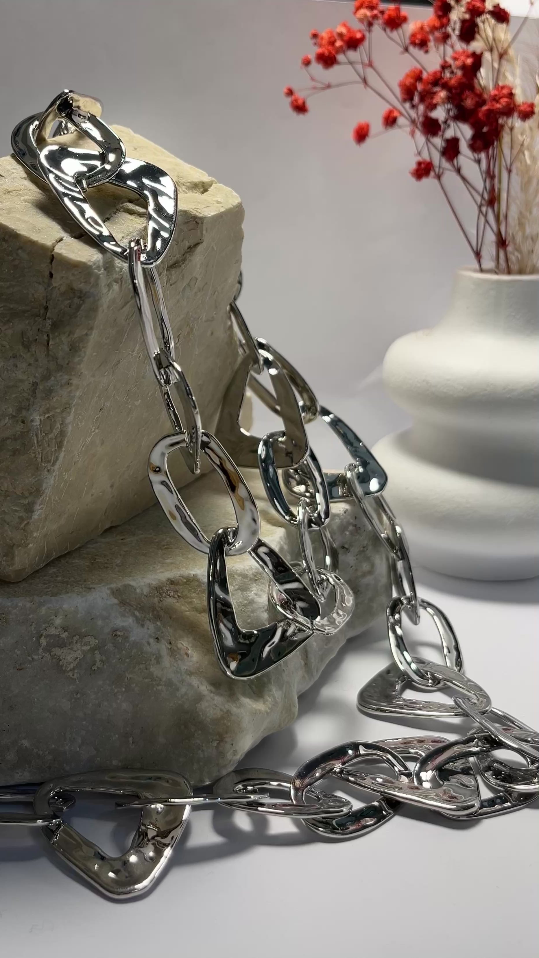 Una collana lunga dal design raffinato e versatile, ideale per impreziosire maglioni e colli alti. Le sue linee morbide e luminose donano equilibrio e carattere, aggiungendo un tocco di eleganza discreta a ogni outfit.