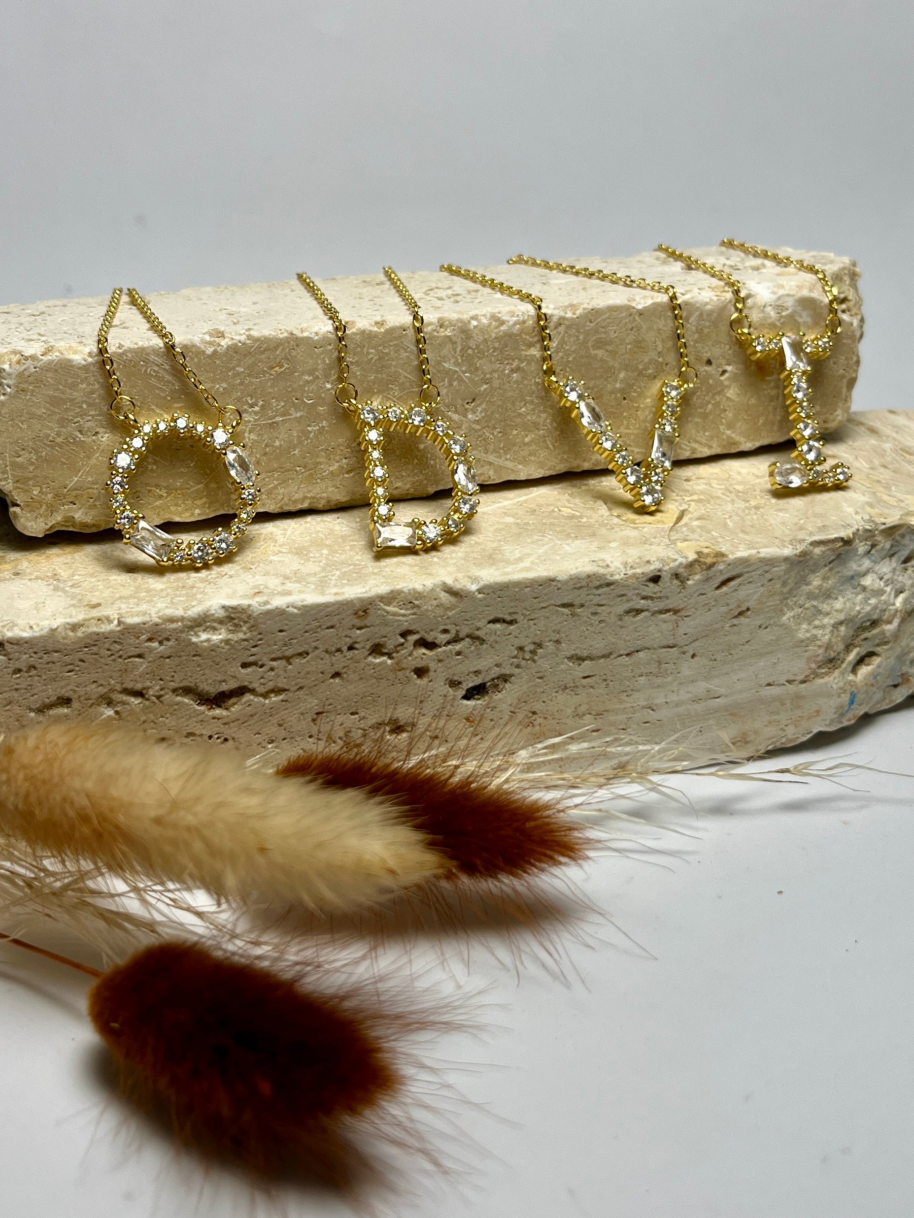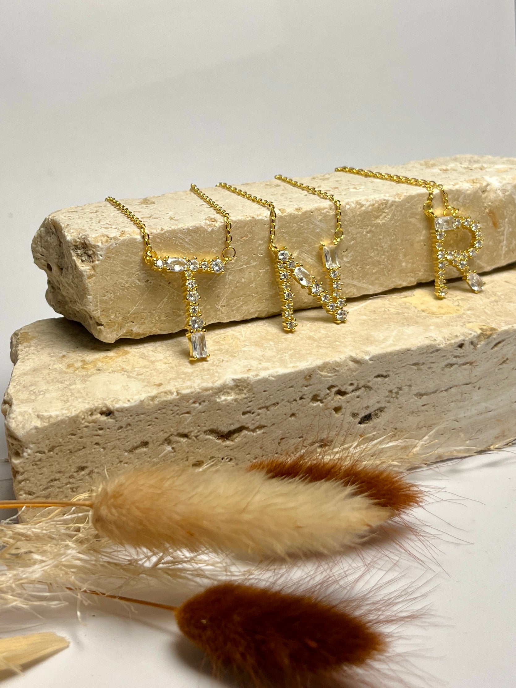 Questa collana con lettera personalizzabile è realizzata con una luminosa finitura dorata e impreziosita da zirconi bianchi taglio brillante e baguette, che riflettono la luce con eleganza.