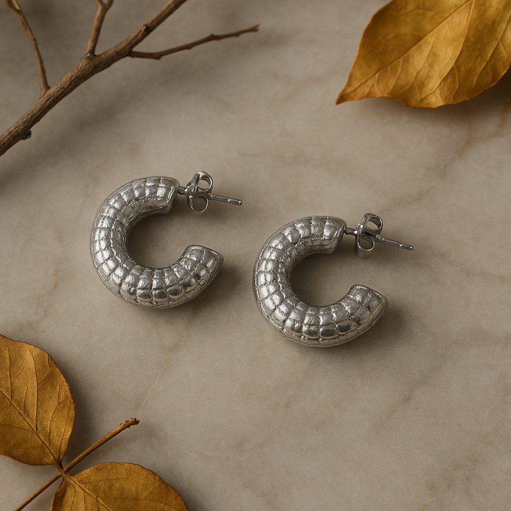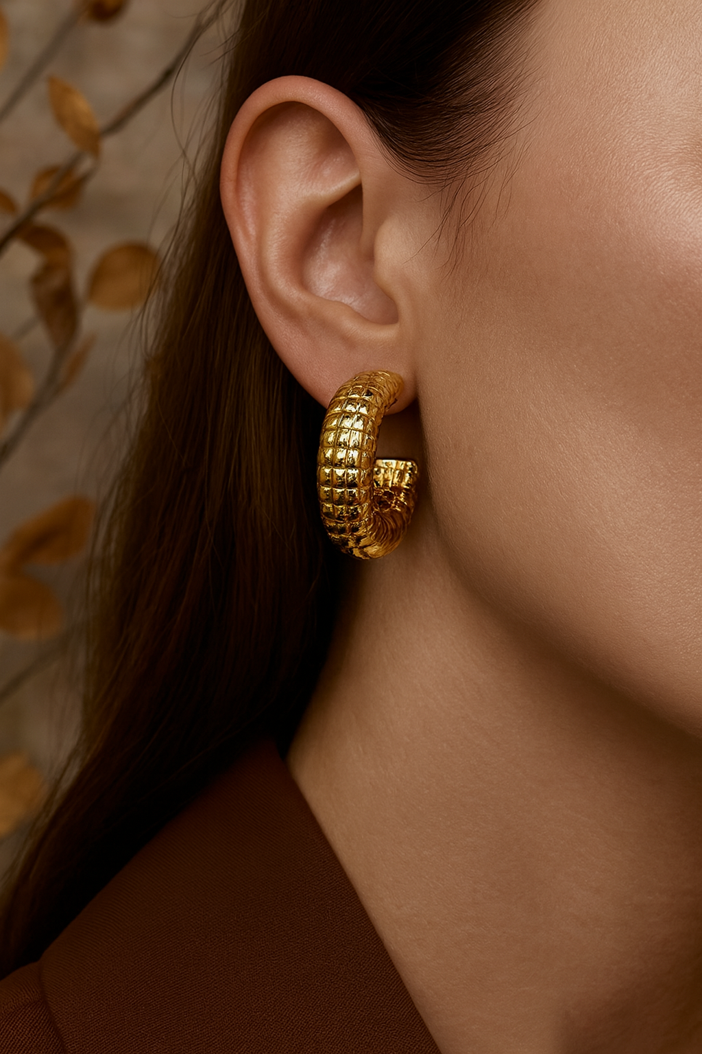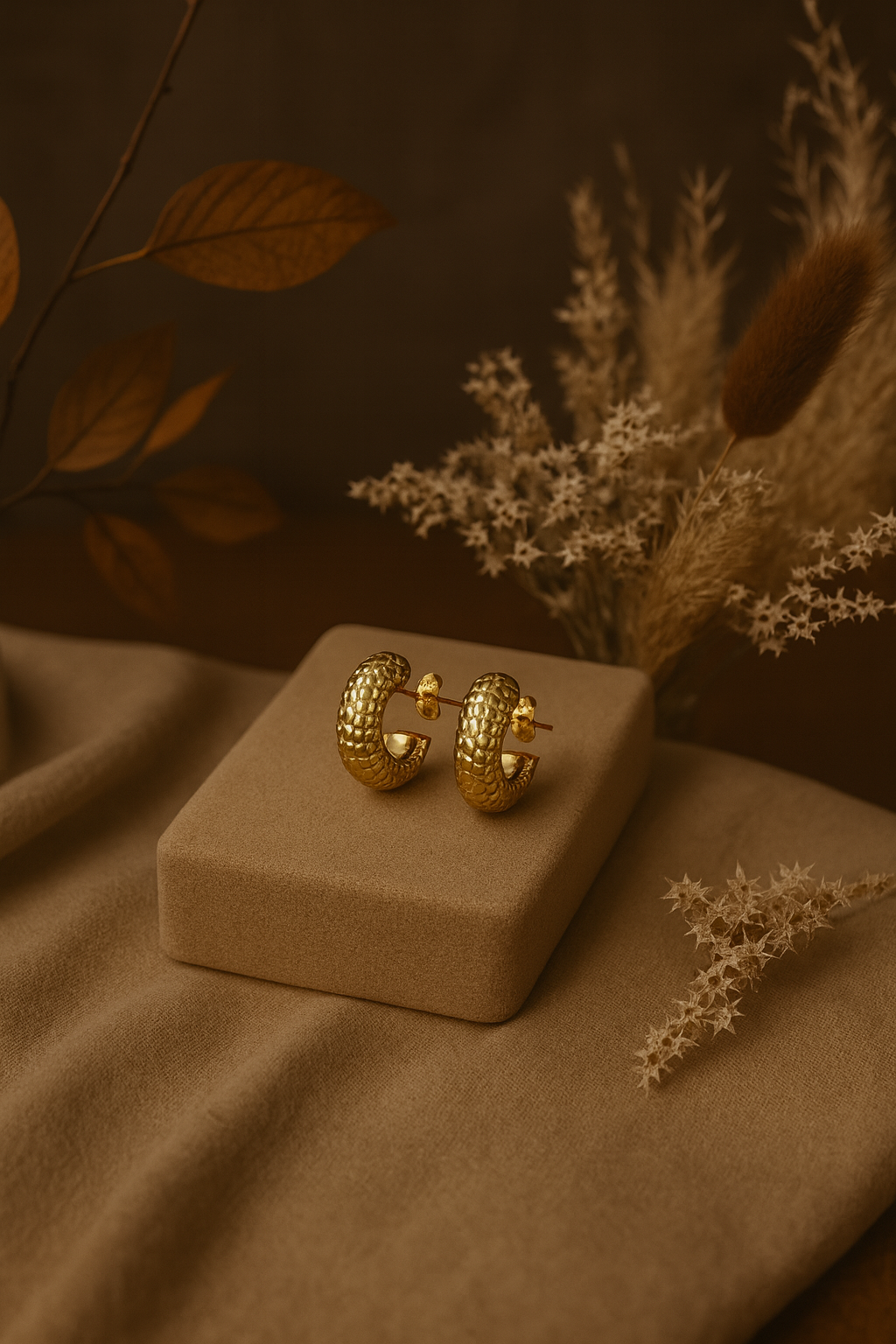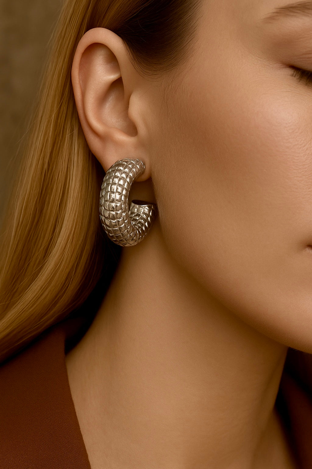 Questi orecchini presentano una forma bombata che avvolge il lobo con eleganza, impreziosita da una lavorazione martellata che crea giochi di riflessi unici ad ogni movimento.