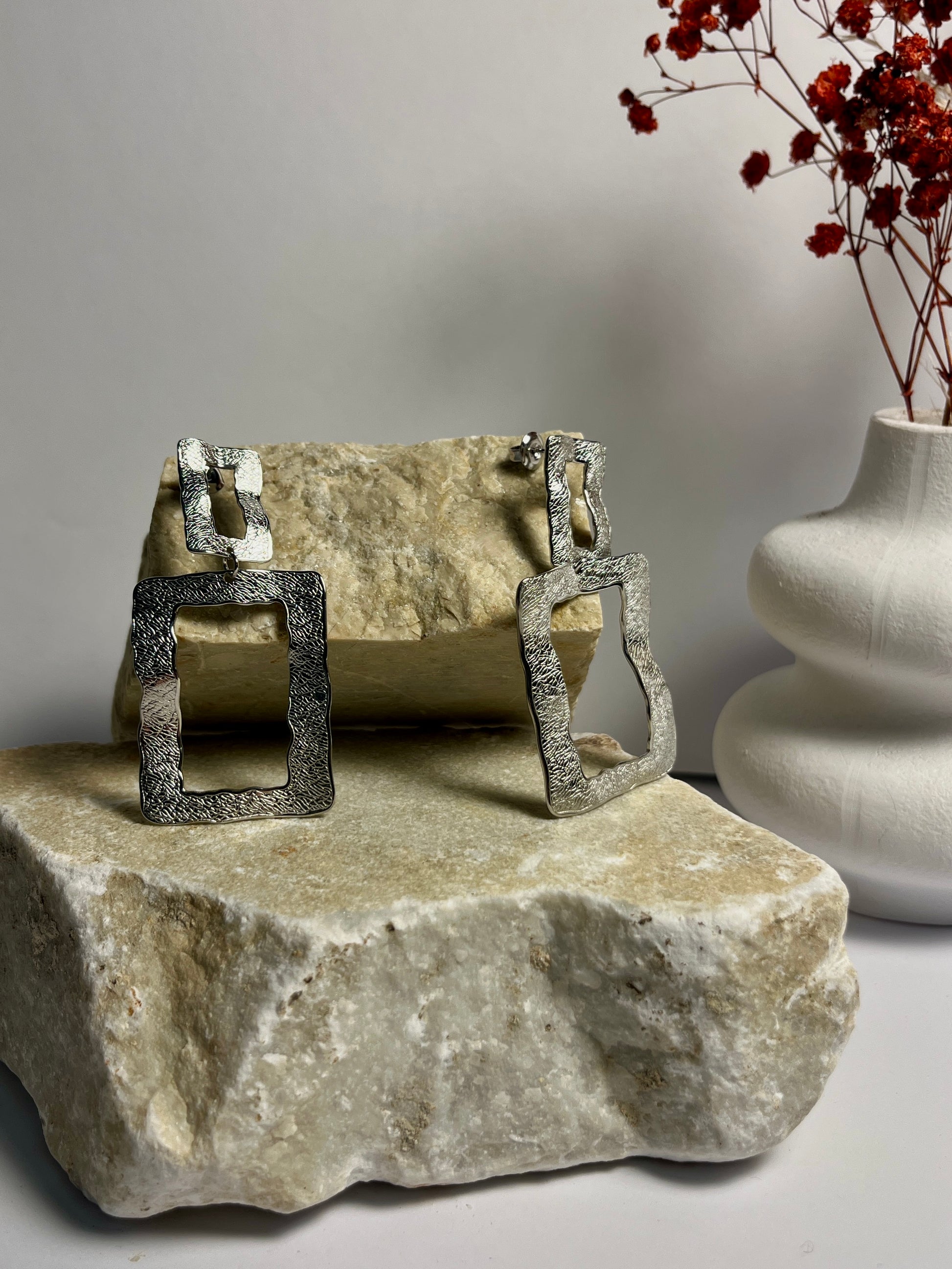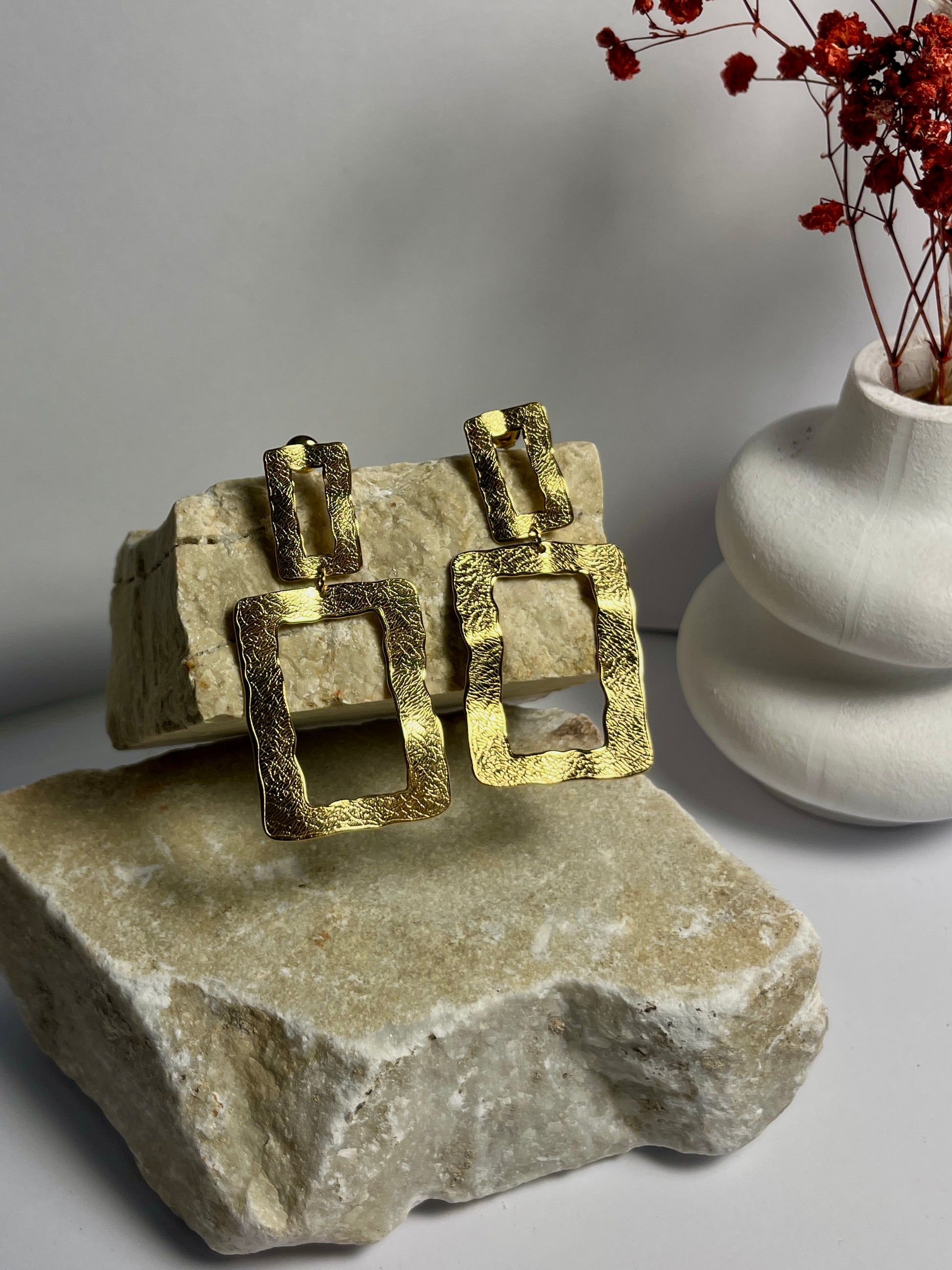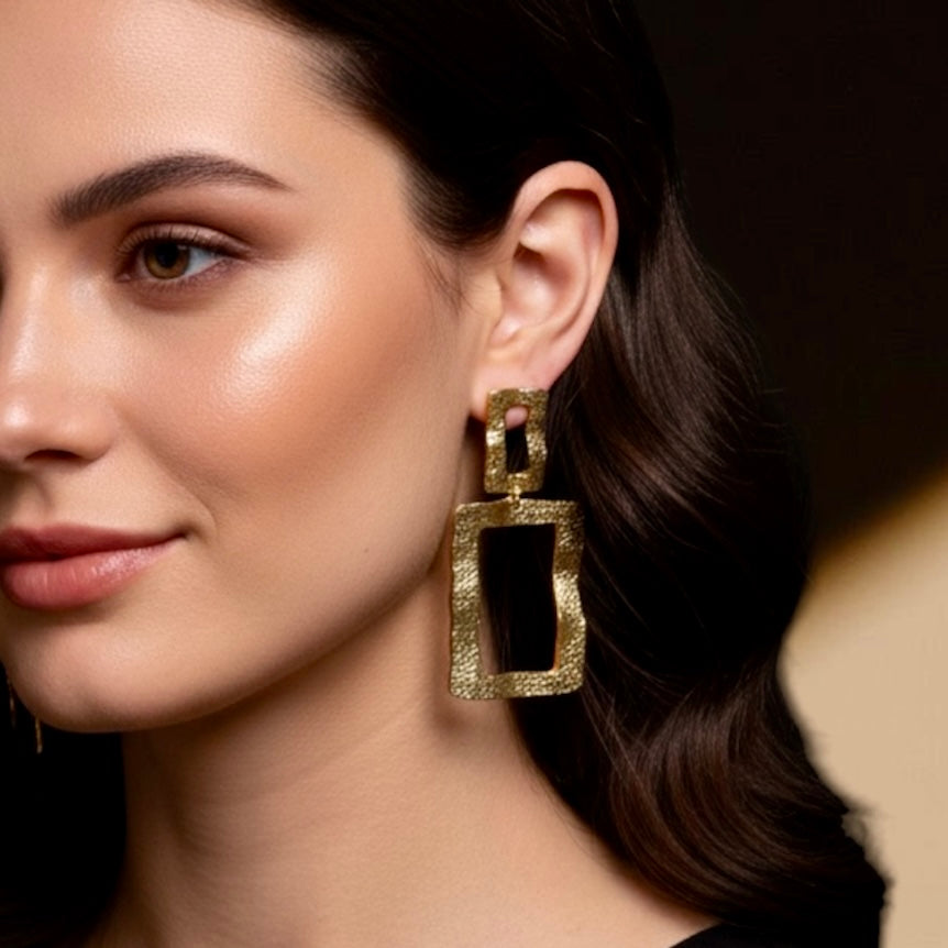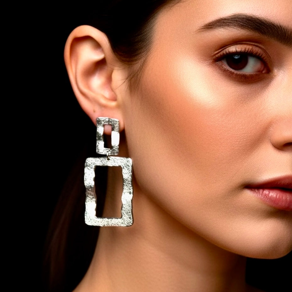 Un orecchino dal design geometrico e contemporaneo, composto da elementi squadrati in bronzo battuto che riflettono la luce con sfumature calde e naturali. La superficie irregolare tipica della lavorazione artigianale dona carattere e unicità, rendendolo un accessorio perfetto per chi ama lo stile essenziale ma deciso.