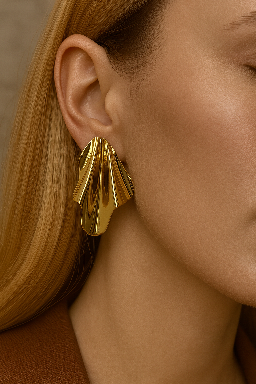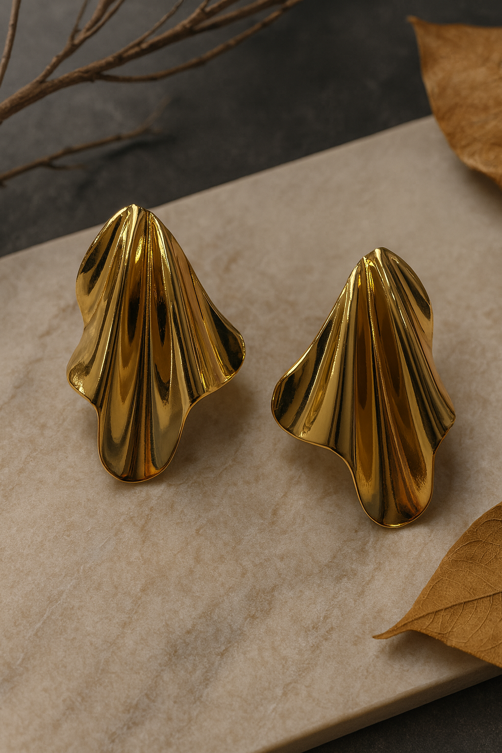 Questi orecchini dalle linee fluide e irregolari ricordano la leggerezza di un tessuto mosso dal vento, trasformando la materia in movimento. La finitura lucida in acciaio placcato oro cattura la luce con riflessi sofisticati, rendendoli il dettaglio perfetto per look eleganti e moderni.