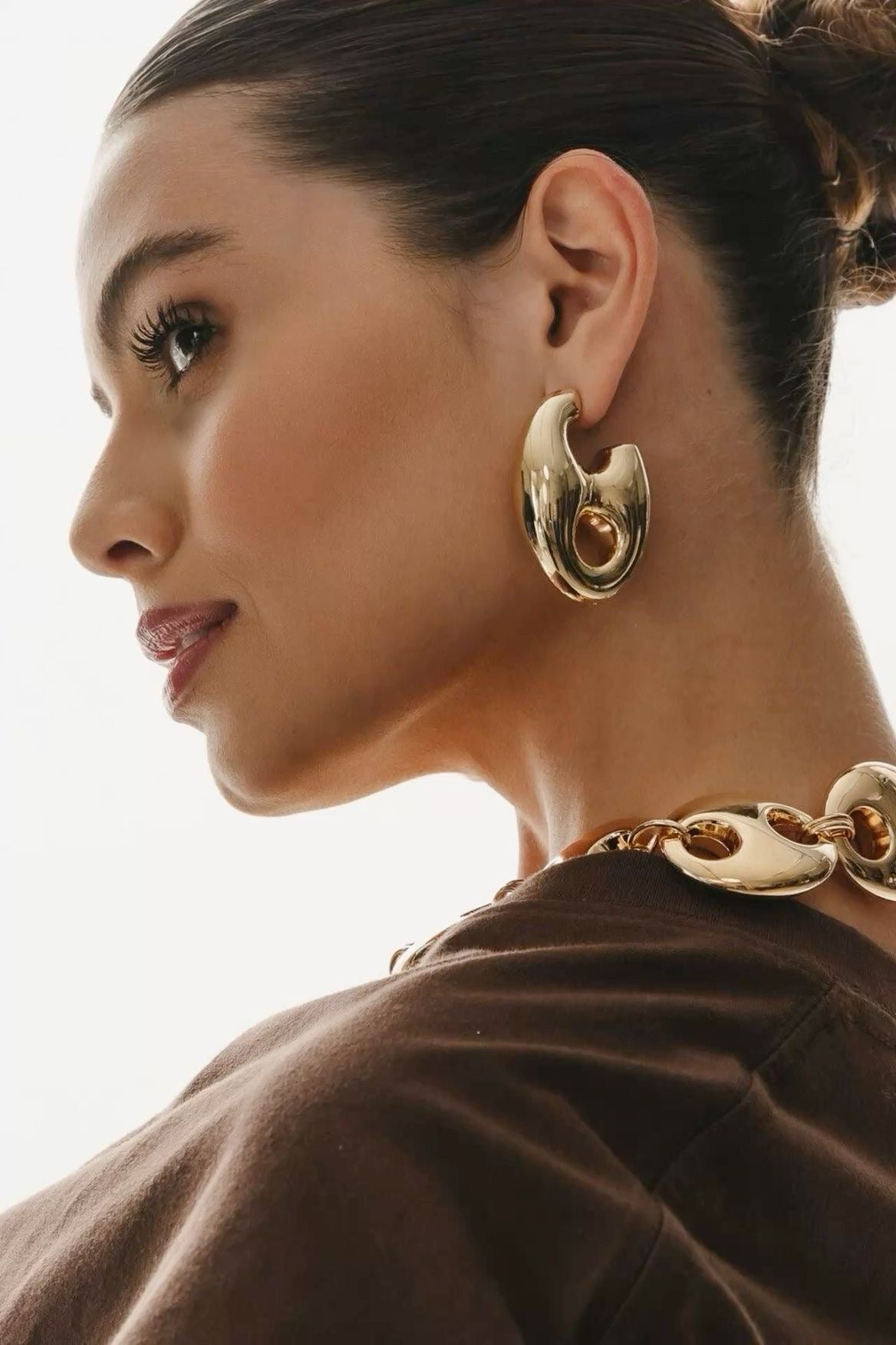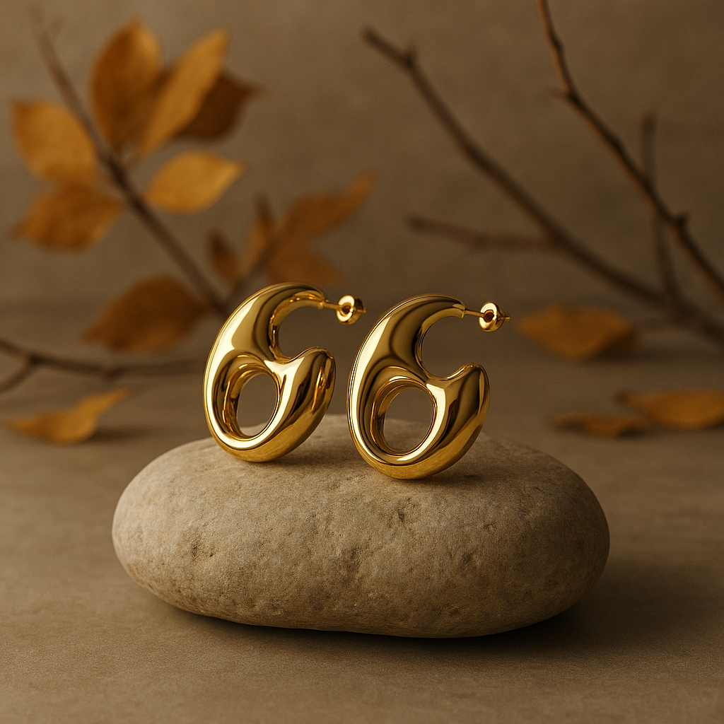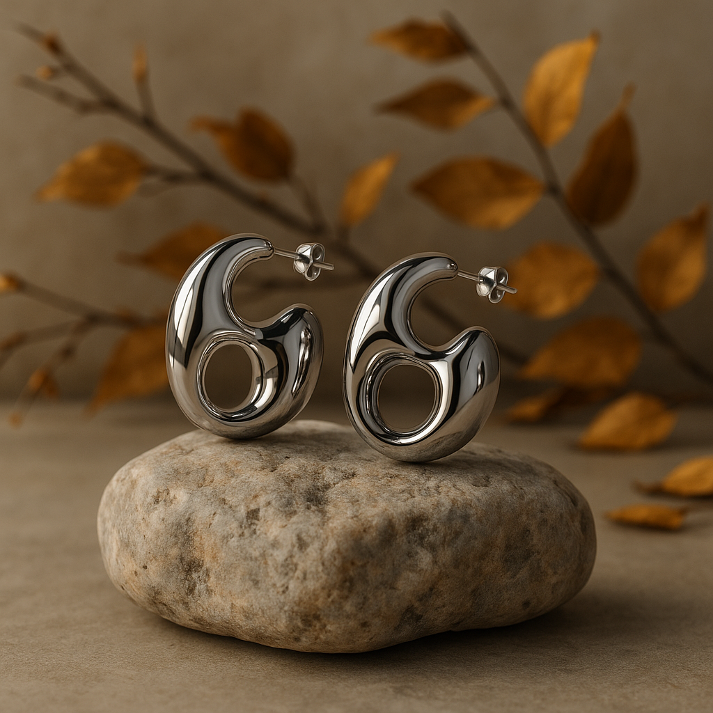 Questi orecchini presentano linee morbide e sinuose, ispirate a forme organiche e naturali. La superficie lucida in acciaio inossidabile riflette la luce come uno specchio, donando profondità e carattere ad ogni look.